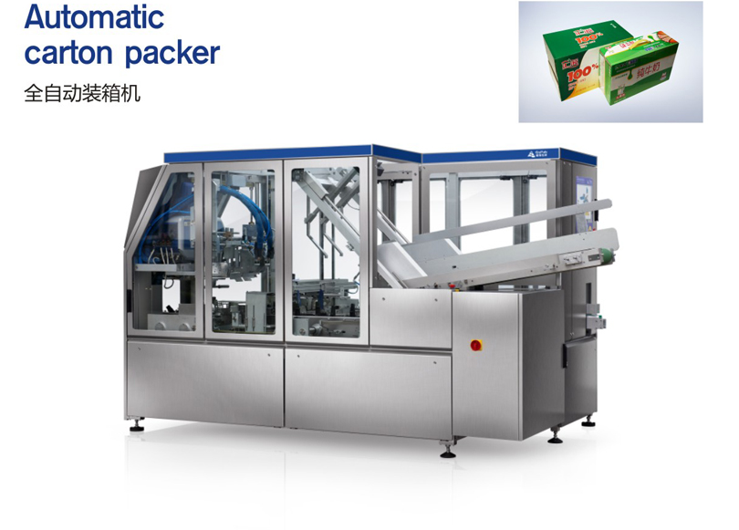 概述:灌装后的成品包通过高速、连续、稳定的自动整列、纸箱成型、折边、封箱等工序完成自动装箱